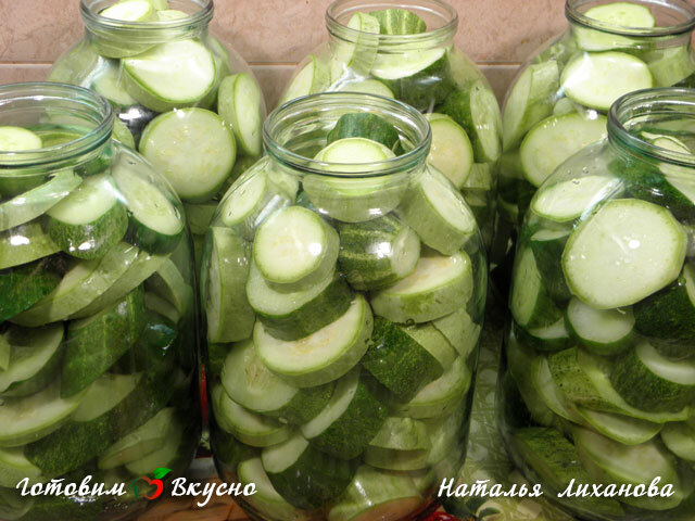 pickled cucumbers with zucchini, slice the cucumbers and zucchinis into 1-2 cm thick rounds, layer them alternately in jars (3 liters).