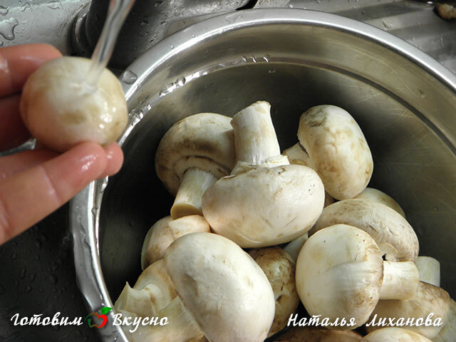 To make marinated mushrooms, take the mushrooms and wash them under running water. There's no need to peel anything, just wash the mushrooms thoroughly with your hands.