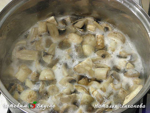 Pour 1 liter of water into a pot, add salt, and bring it to a boil. Then add the prepared mushrooms and boil them for 10 minutes. Remove from water and set aside.