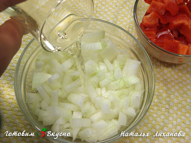 Peel and dice the red bell pepper, also dice the onion (you can chop it finely or in larger pieces, as you prefer). Pour vinegar over the onion and set aside to marinate.