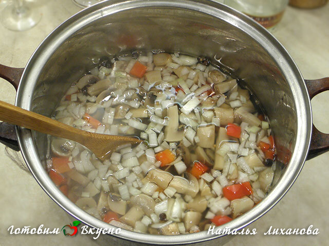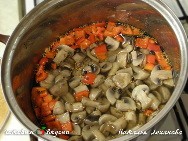 Pour a liter of water into a pot, add the red bell pepper, spices, salt, and sugar. Bring to a boil, add the mushrooms, let them boil, and then remove from heat.