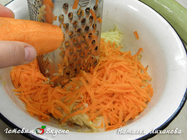 To prepare the vegetable kugel, grate potatoes, onions, and carrots with a coarse grater. Finely chop the garlic.