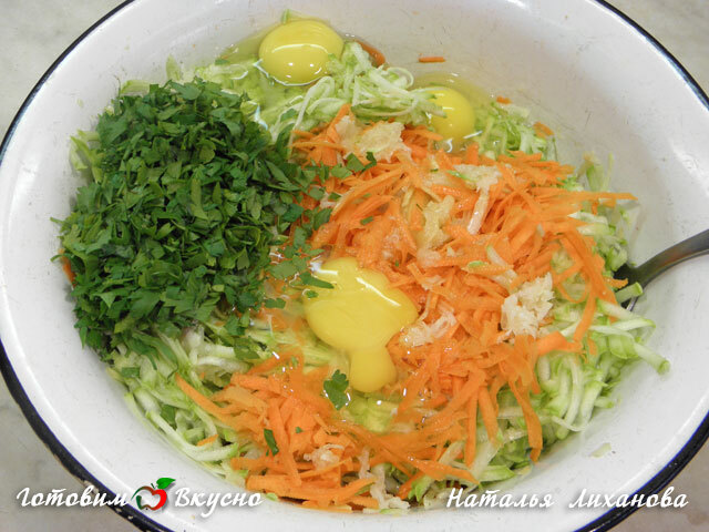 Mix everything and add breadcrumbs, eggs, parsley, basil, salt, and pepper. Stir until you get a thick dough.