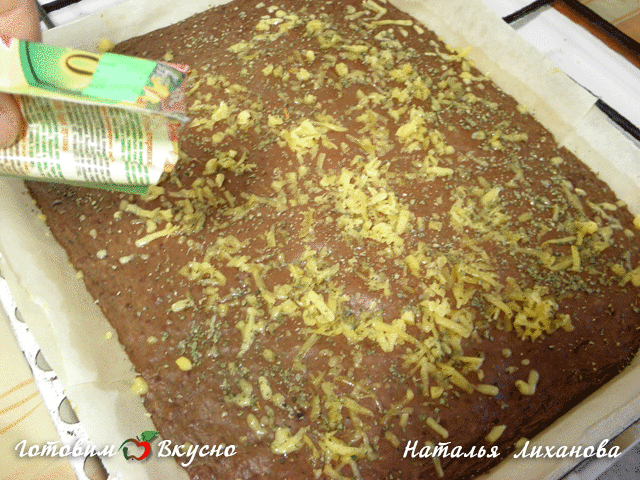 Sprinkle grated cheese over the hot liver layer, spread evenly. Sprinkle with herbs and roll up the roll using the parchment paper (this may require some effort). Wrap the rolled liver roll tightly in the paper and place it back in the oven for 5-10 minutes.