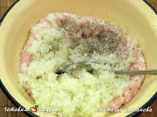 To prepare the peasant pie, let's start by preparing the filling. Finely chop the onion (you can use a blender), mix it with the ground meat, add salt and pepper to taste. The filling is ready!