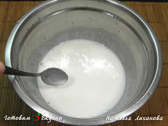Let's prepare the dough for the peasant pie. Mix the baking soda with kefir and leave for 5 minutes.