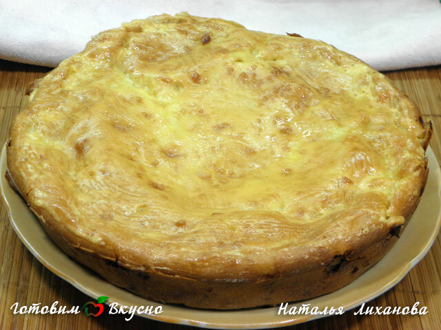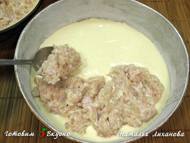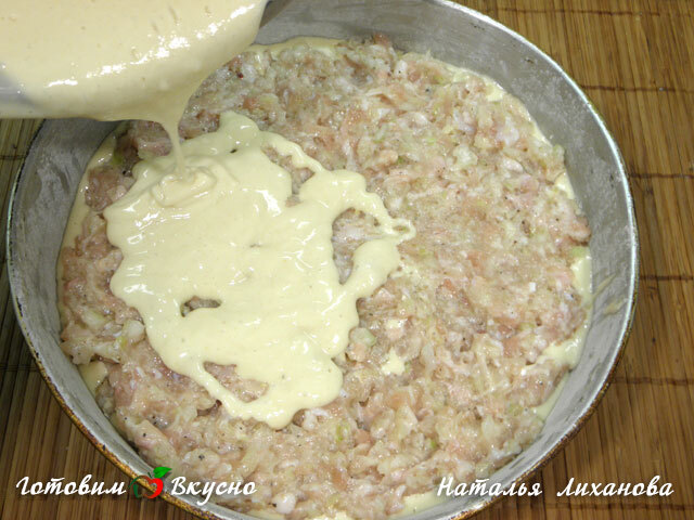 Grease a baking dish with butter, sprinkle with flour, and pour half of the dough. Spread the filling (raw ground meat) and pour the second half of the dough over it.