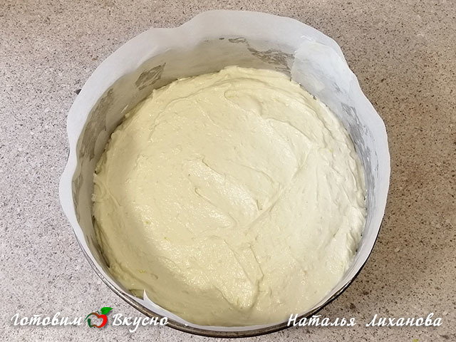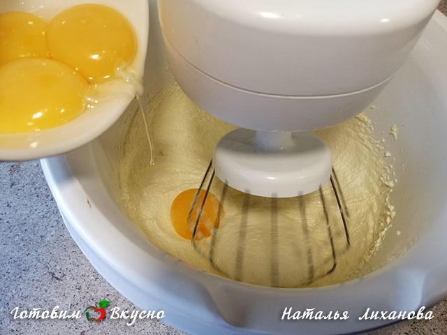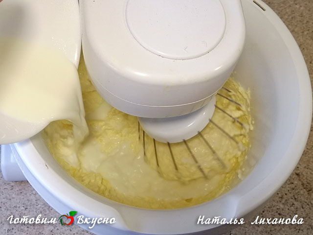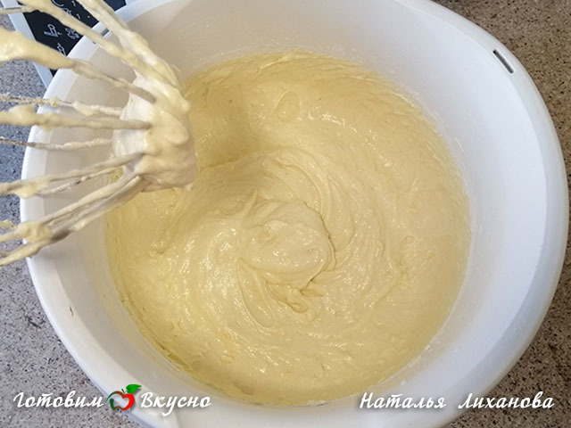 Lastly, add the flour with baking powder, mix with a mixer until a uniform consistency.