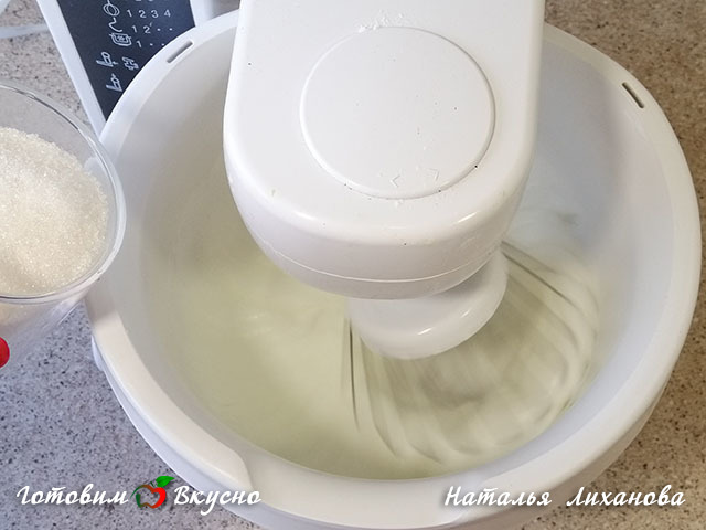 In the mixer bowl, place the egg whites, salt, lemon juice, and start beating until soft fluffy peaks, then add sugar gradually.