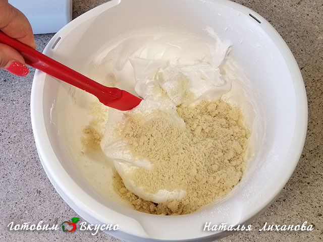 Beat the egg whites until stiff peaks form, then add almond petals or almond flour. Gently fold the mixture from bottom to top, no need to mix for too long to avoid deflating the whites.