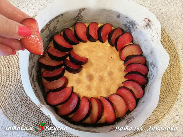 Remove the baked crust from the oven, do not turn off the oven. Place the plums on top.