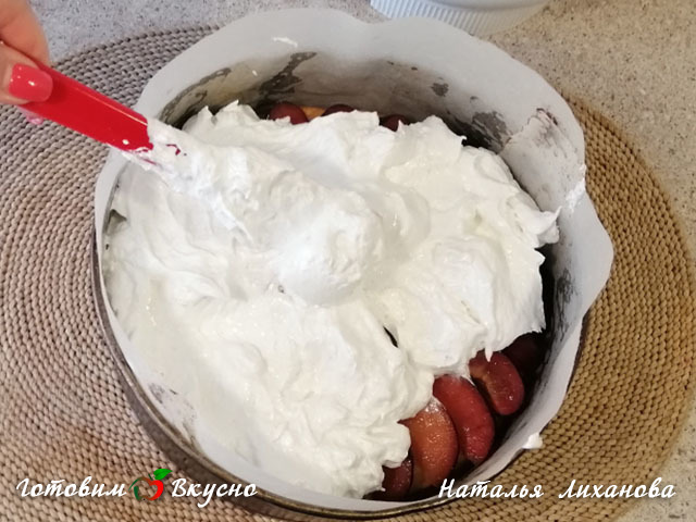Spread the dough, flatten it, and place it in a preheated oven at 180 degrees Fahrenheit for 30 minutes. This time will be enough to prepare the plums and beat the meringue.