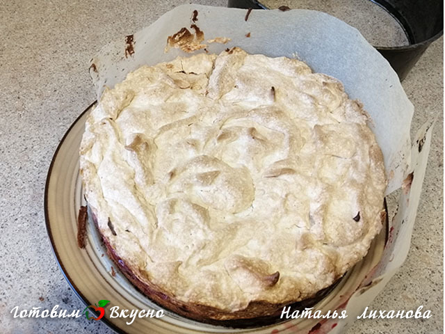 The plum and crispy meringue pie is ready! Remove the parchment paper, let it cool slightly, and enjoy!