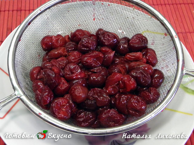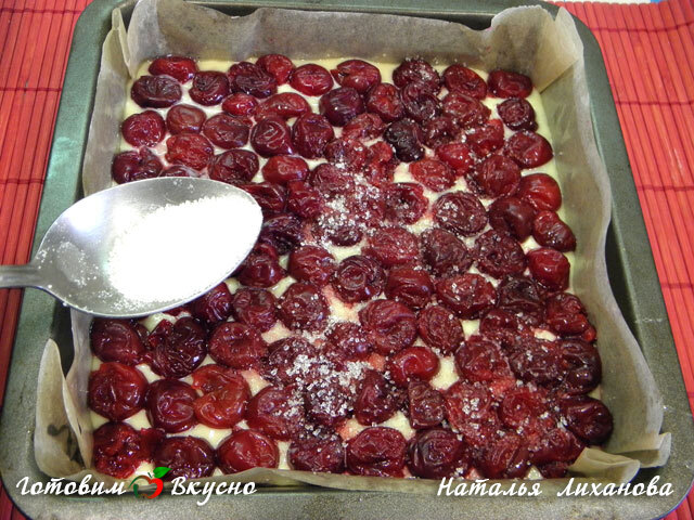 Line a baking form with parchment paper, lightly grease it with butter. Spread half of the prepared batter. Add cherries on top and sprinkle them with sugar.