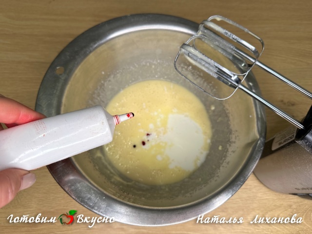 Add warm kefir and food coloring, stir. If the dough is not red enough, add a little more food coloring.