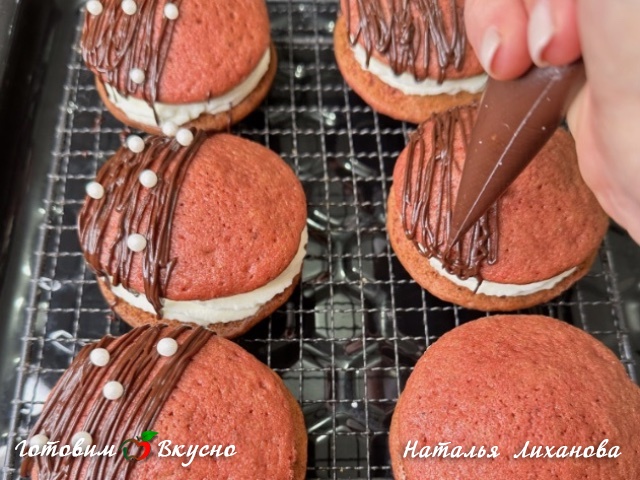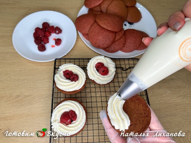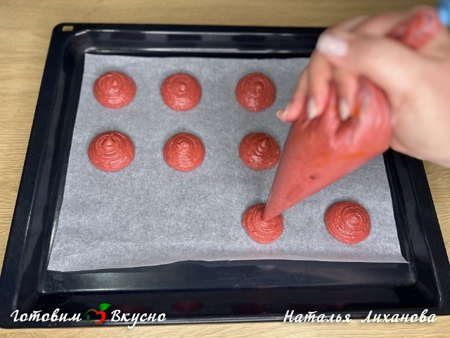 I lined a baking sheet with parchment paper. Using a pastry bag, scoop the dough into circular shapes with a diameter of about 1.5 inches. Leave some space between them, the circles will increase in size during baking. Bake in a preheated oven to 350°F for 10-12 minutes, then let cool.