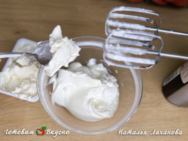For the cream, first beat the cold cream with powdered sugar until stiff peaks form. Then add the cream cheese and simply stir with a whisk until smooth.