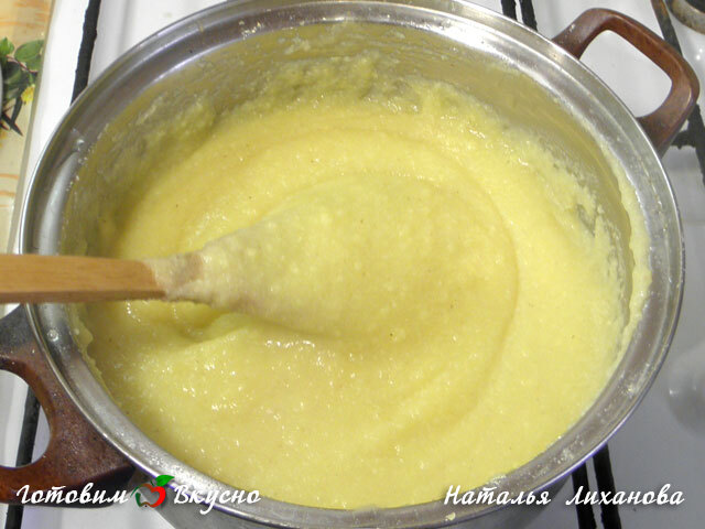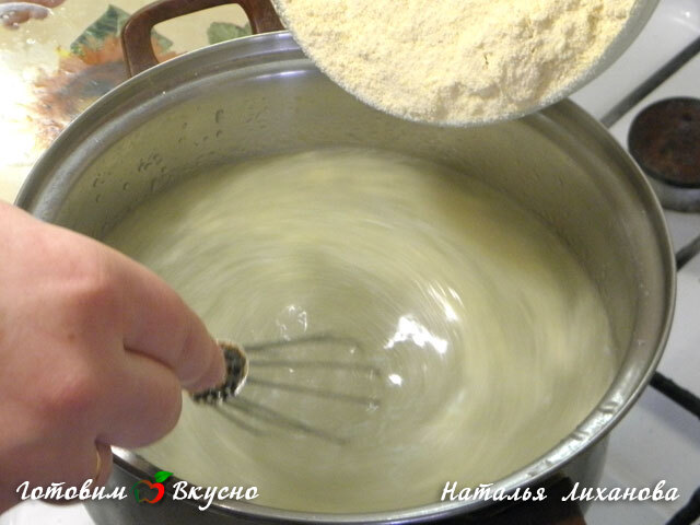 To prepare polenta, pour water into a saucepan with a thick bottom and place it on the heat. When the water boils, add butter, salt, and gradually sprinkle cornmeal into the water, stirring constantly.