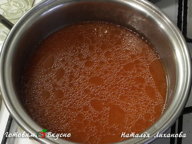 To prepare pink rice, pour broth, add salt, sunflower oil, and tomato paste to a saucepan. Stir and bring to a boil.