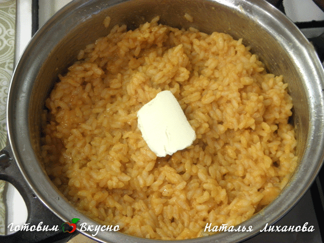 Pour rice into the boiling mixture and cook on low heat with the lid on. Once the rice is ready, add a knob of butter and mix.
