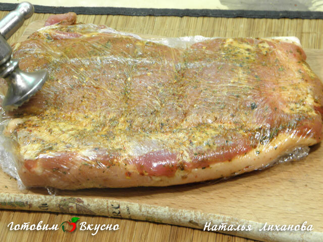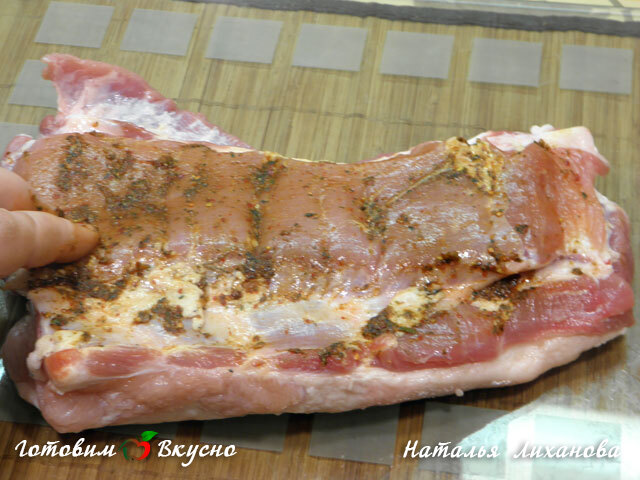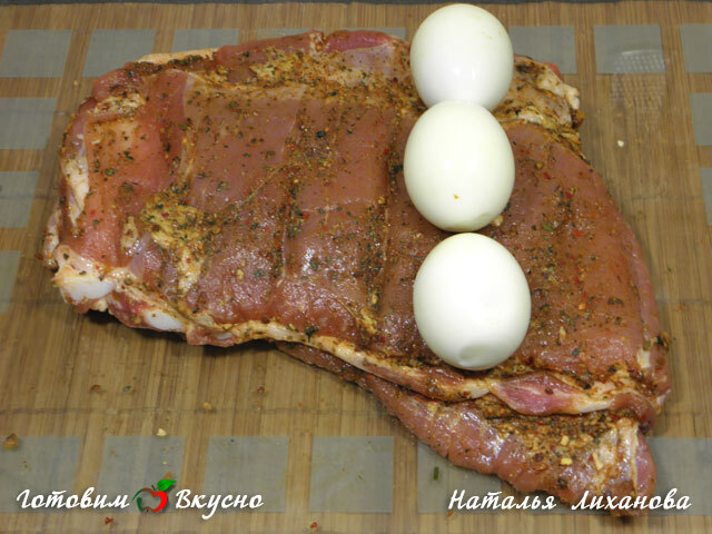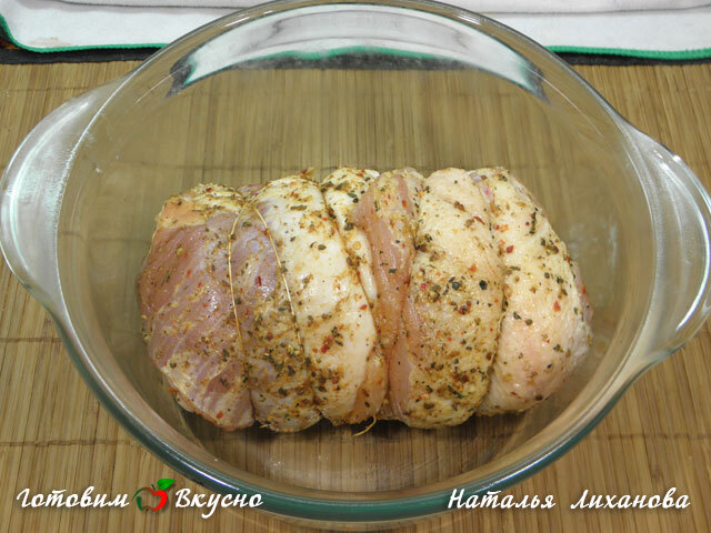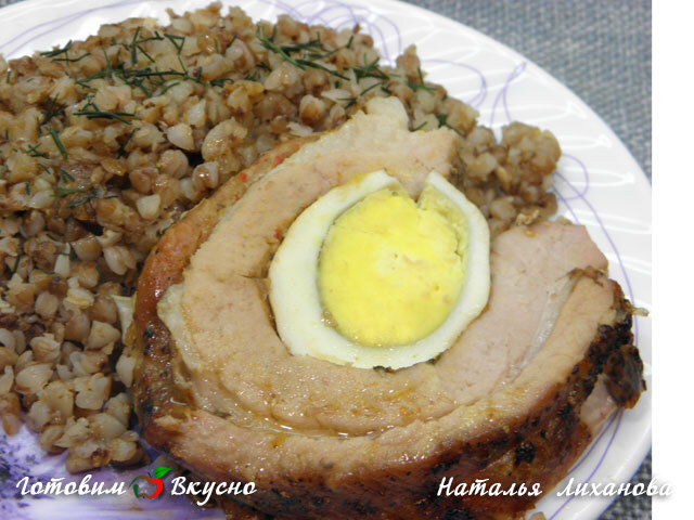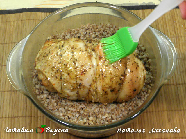 After this time, remove the pork roll from the oven, remove the cover, and transfer the roll to a plate. In the dish where the roll was baked, sprinkle the buckwheat, mix it well with the remaining juice and fat. Then place the roll on top of the buckwheat. Brush it with