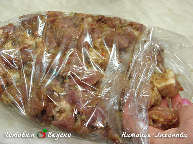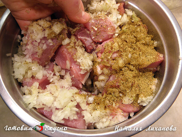 Add the onions, pepper, and shashlik seasoning to the meat. Mix everything well, gently knead with your hands, and refrigerate to marinate for 3-4 hours (overnight is also an option).