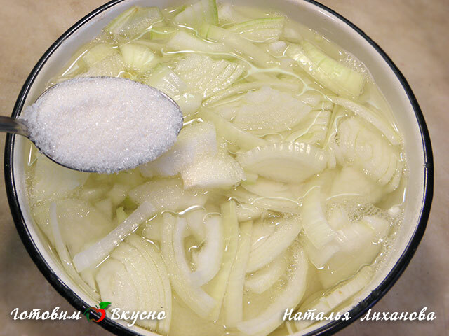 One hour before cooking the shashlik, prepare the onions. Slice the remaining 7 onions into half rings, pour boiling water over them (water should cover the onions). Add vinegar, sugar, and lemon juice. Let the onions marinate for one hour.