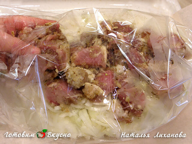 Take an oven bag and tie one end. Drain the water from the onions, place them in the bag, and spread them out (prepare a "bed" for the meat). Remove the meat from the refrigerator, season with salt (I use 1.5-2 tsp), mix it, and place it evenly on top of the onions.