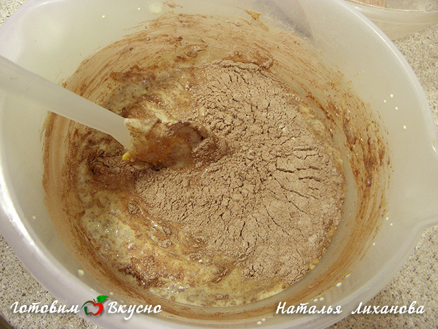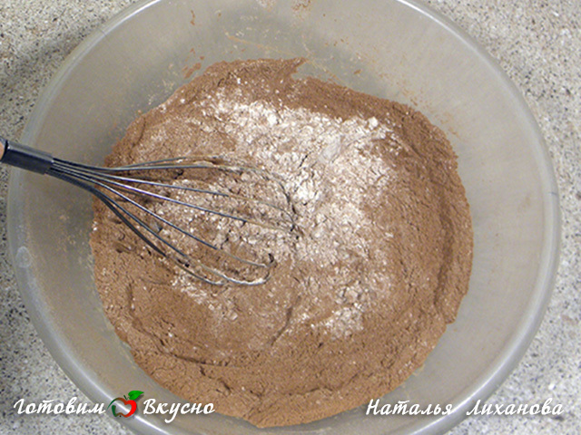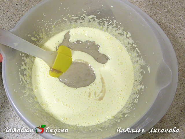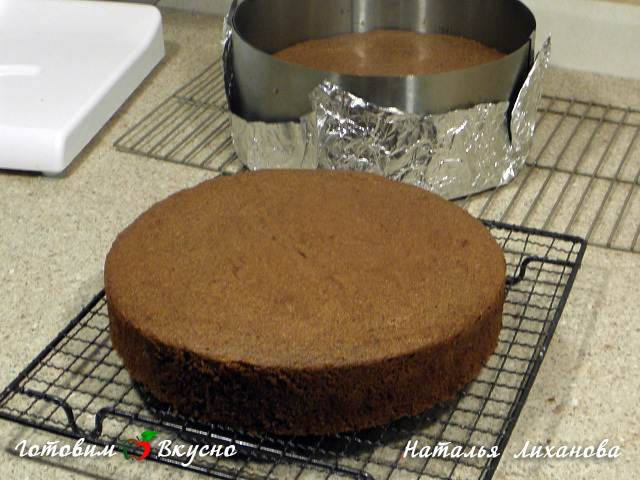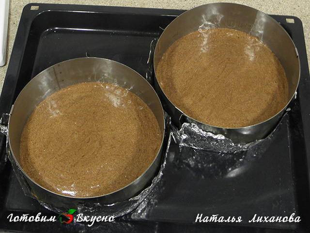 I baked the cake layers in 2 rings with a diameter of 20 cm, wrapped in foil. I placed parchment paper on the bottom, without greasing it. Bake the cake layers in a preheated oven at 170 degrees Fahrenheit for 30-35 minutes (adjust according to your oven).
