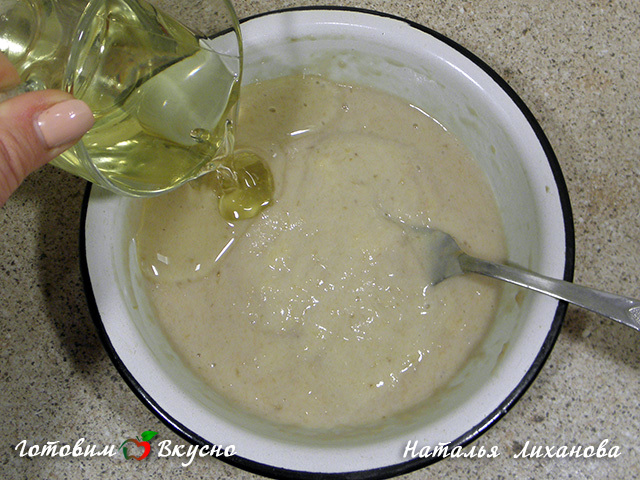 Make banana puree, then add milk and vegetable oil to it. Mix well.