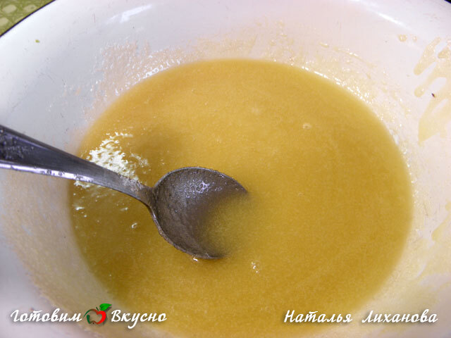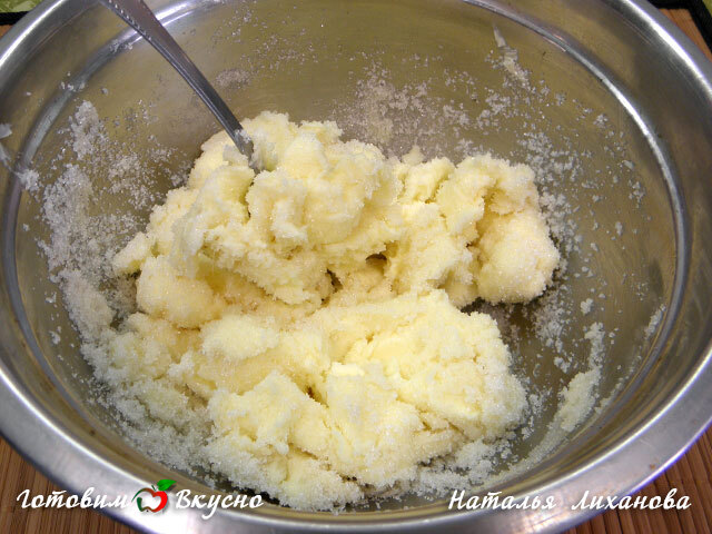 Gradually add the butter with sugar to the cooled mixture, gently mix with a spoon.