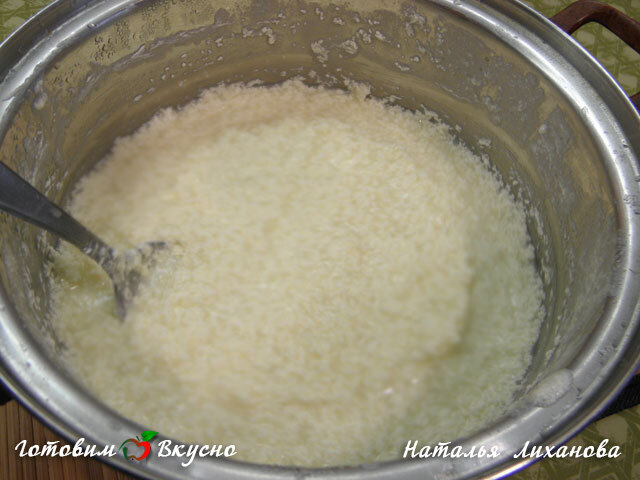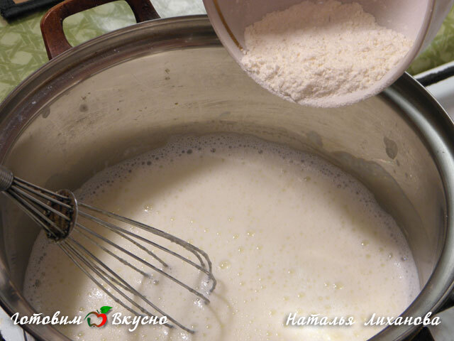 In a separate bowl, mix the starch, flour, and sugar. When the milk boils, gradually add the dry ingredients, mix and let it cool. Stir the mixture periodically while cooling.