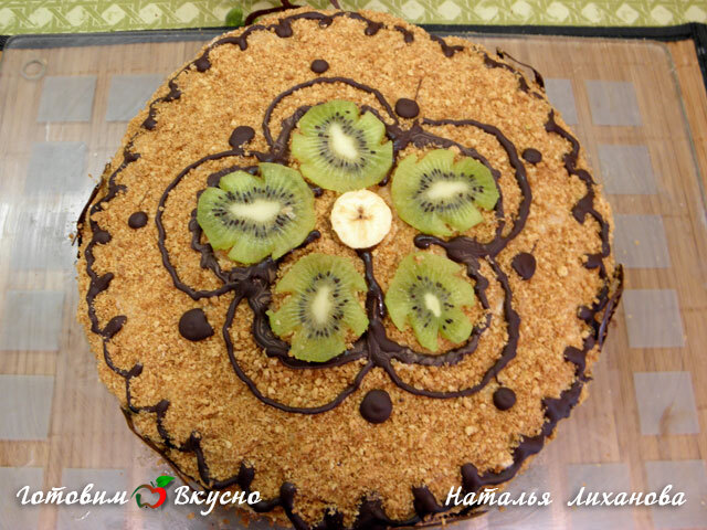 Decorate the honey cake "Medovik" with chocolate and kiwi (feel free to get creative or simply use sprinkles).