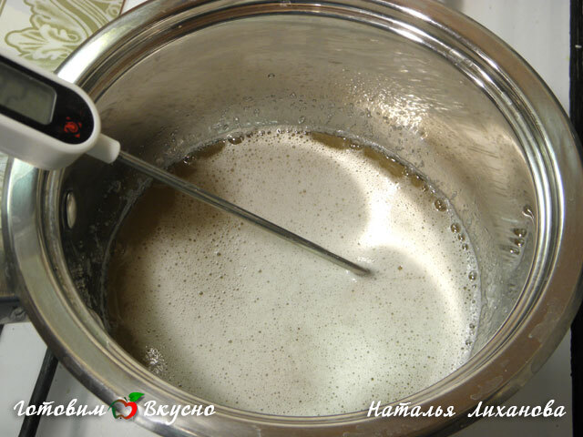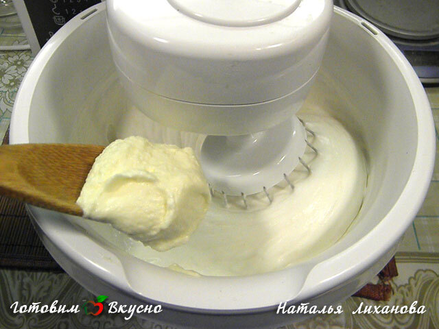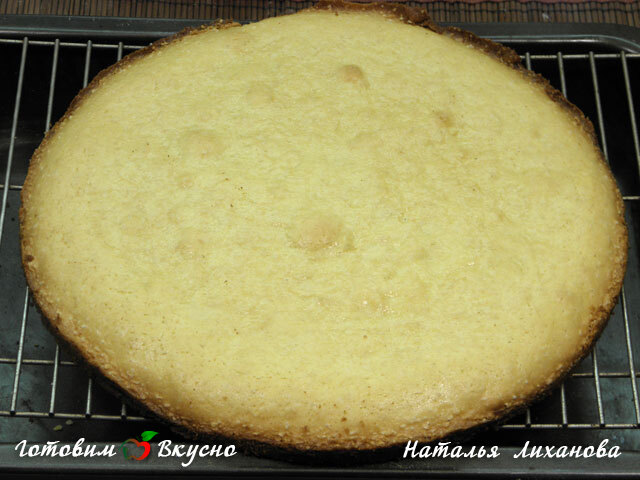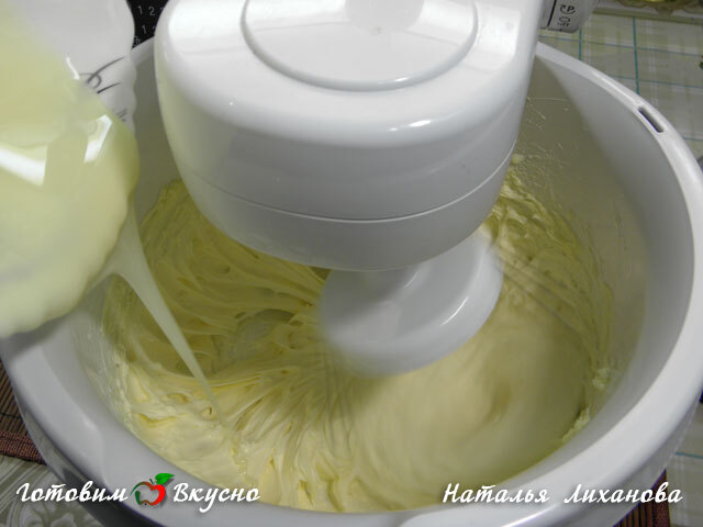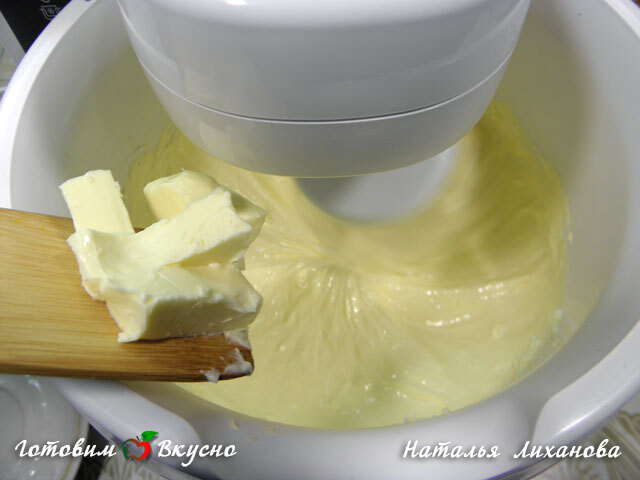 While the crust is cooling, prepare the souffle for the "Bird's Milk" cake. First, prepare the buttercream. Beat soft butter until light and fluffy at high speed. While still beating, add condensed milk until you get a fluffy homogeneous mass. Leave the finished cream at room temperature; do not refrigerate.