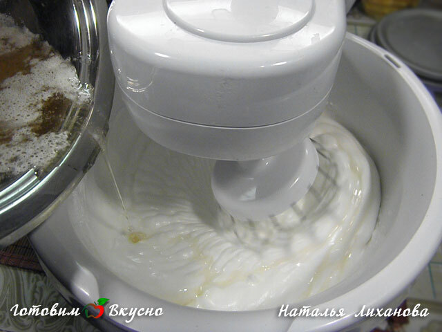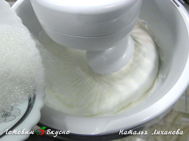 Take the egg whites from the refrigerator and beat them at high speed until stiff peaks form. While still beating, add lemon juice and gradually add 1 cup of sugar and 1/2 tsp of vanilla sugar.