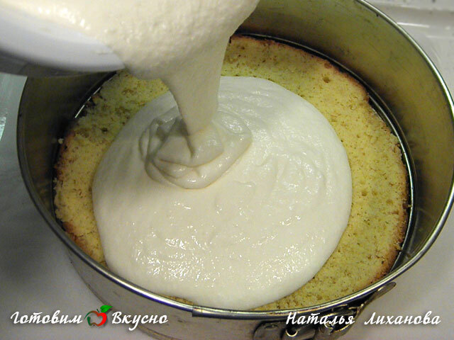 Cut the crust in half lengthwise with a long sharp knife. Place one half on the bottom of a 10-inch springform pan, spread half of the prepared souffle on top, cover with the second half of the crust, and spread the remaining souffle. Smooth the surface. Place the cake in the refrigerator for 2 hours or overnight.