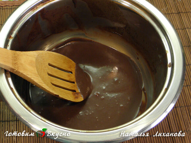After 2 hours (or in the morning), prepare the chocolate glaze. Pour cream into a saucepan, add sugar and heat on the stove until the sugar is completely dissolved. Add chocolate (chopped into pieces) to the hot cream with sugar, stir until smooth and shiny. Then add butter and stir until homogeneous.