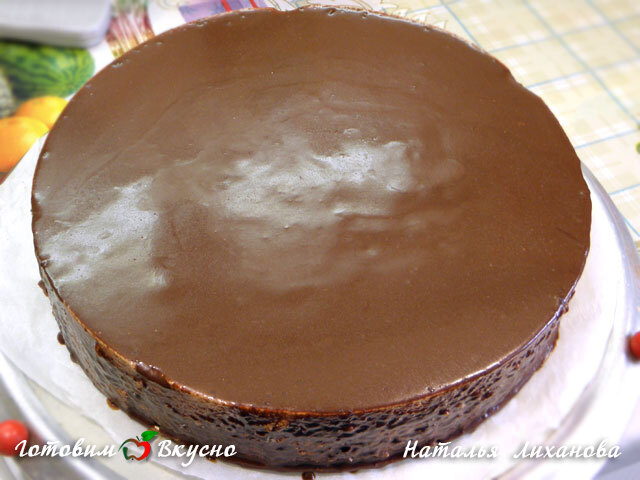 Carefully detach the cake from the sides of the pan with a sharp knife and transfer it to a board or plate. Pour the cooled glaze over the cake, smoothing the top with a flat spatula. Remove any excess glaze from the sides of the cake. Then place the cake in the refrigerator for at least 1 hour to set the glaze.