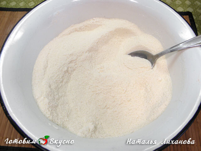 To prepare the apple cake, combine and mix the flour, semolina, sugar, and baking soda. Divide the resulting dry mixture into 5 equal parts.