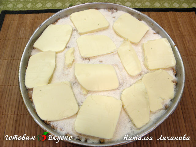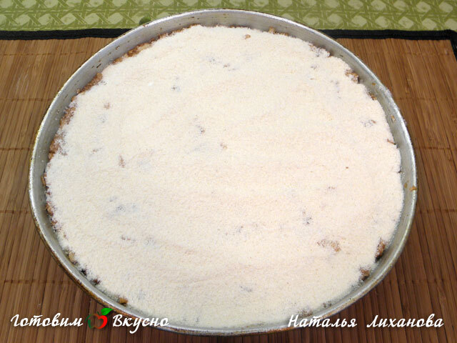 Pour 1 part of the dry mixture into a buttered pan, then evenly spread 1 part of the grated apples on top.