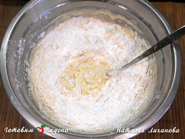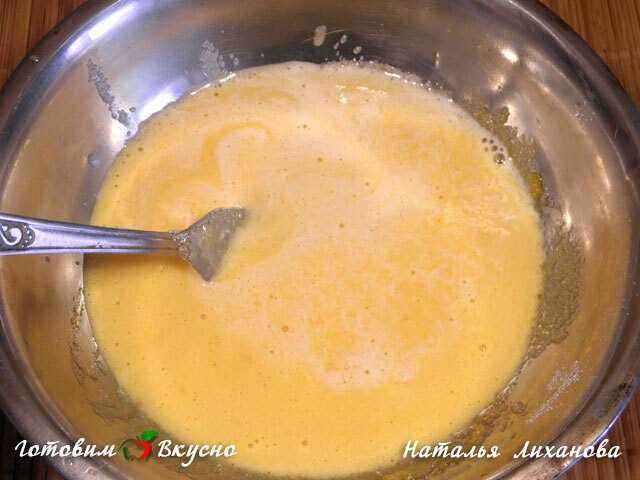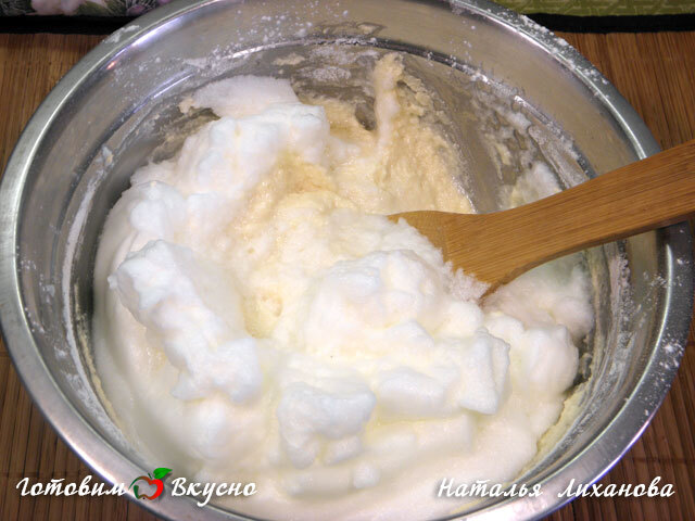 Separate the whites from the yolks. Place the whites in the refrigerator, and add half of the sugar to the yolks and beat until white and foamy. Add the second half of the sugar to the swollen semolina and mix. Combine the beaten yolks and semolina, mix well.