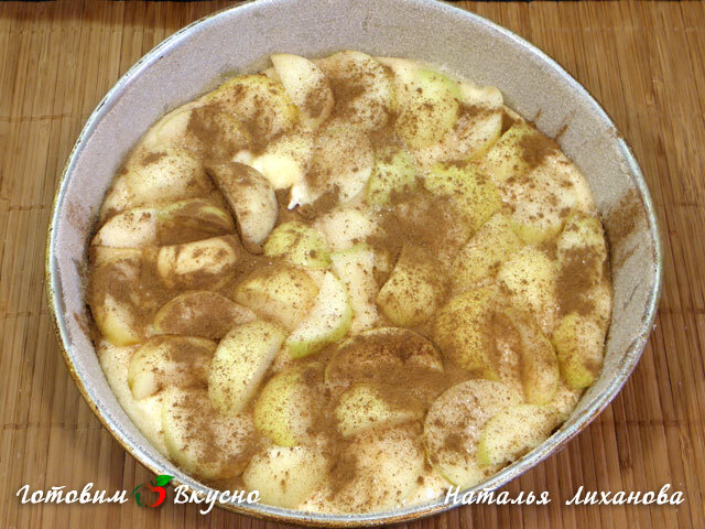 Pour the batter into a greased and semolina-sprinkled pan, but not all of it. Leave about 1/5 of it. On top of the batter, place chopped apples, sprinkle them with sugar and cinnamon.