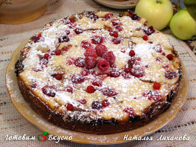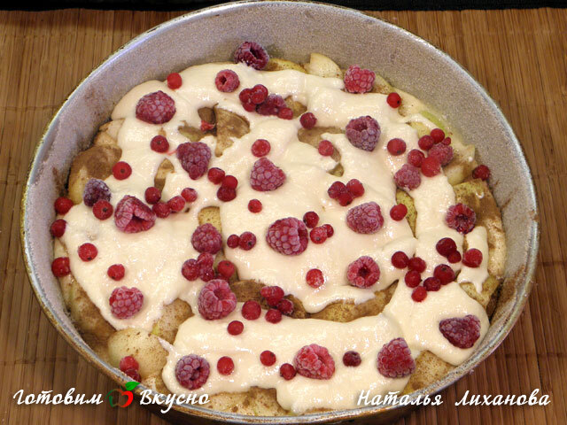 Pour the remaining batter over the apples, then arrange currants and raspberries on top, bake in a preheated oven to 350 degrees Fahrenheit for 40-50 minutes.