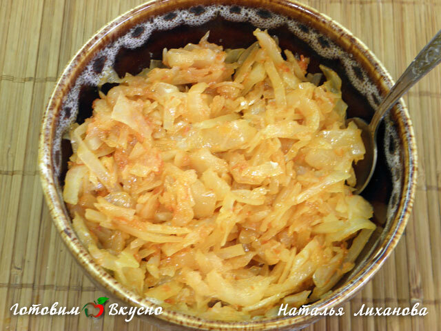 To begin, let's prepare the filling for the cabbage dumplings with yeast dough. Pour vegetable oil into a deep skillet, heat it up and add shredded cabbage. Let the cabbage sauté a bit, then add tomato juice (you can use tomato paste), salt, pepper, cover with a lid and simmer until ready. If necessary, add a little water.