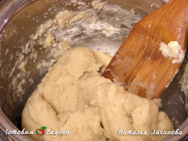 Remove from heat and let the dough cool slightly, then beat in the eggs one by one, thoroughly mixing after each addition. Add the remaining flour and knead the dough.