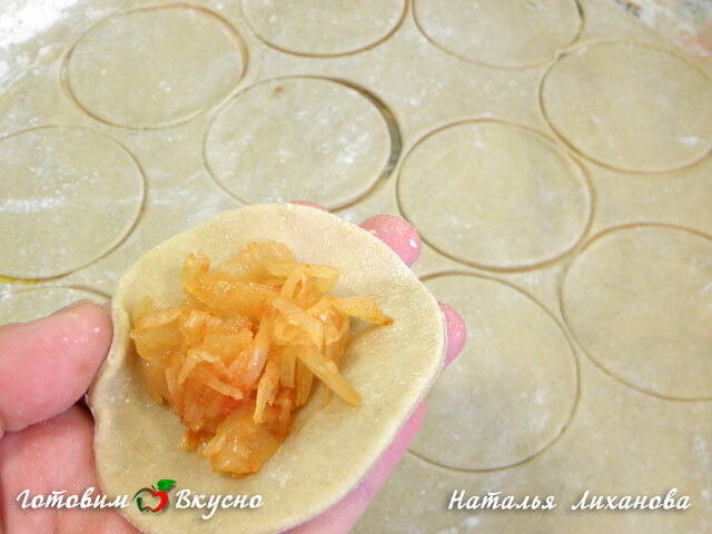 Roll out the dough into a sheet and cut out circles with a glass or a convenient cutter. Place the filling in the middle and seal the edges well.