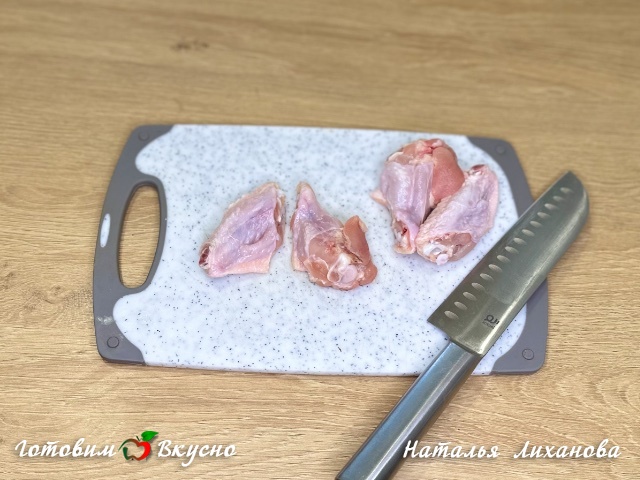 Wash the chicken wings, pat them dry with paper towels, and cut them in half.