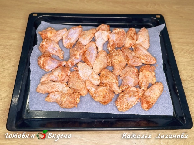 Line a baking sheet with parchment paper and place the wings on it. Put the wings in an oven preheated to 350°F for 30-35 minutes.