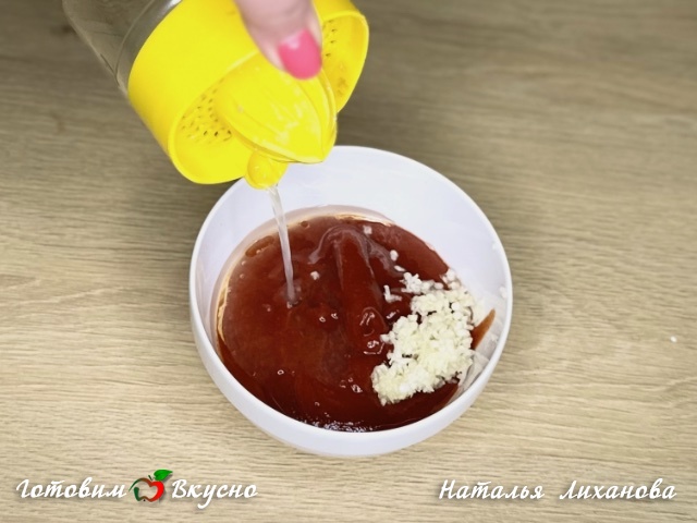 Meanwhile, prepare the sauce. Add garlic, honey, vegetable oil, and lemon juice to ketchup. Mix everything, and the sauce is ready!