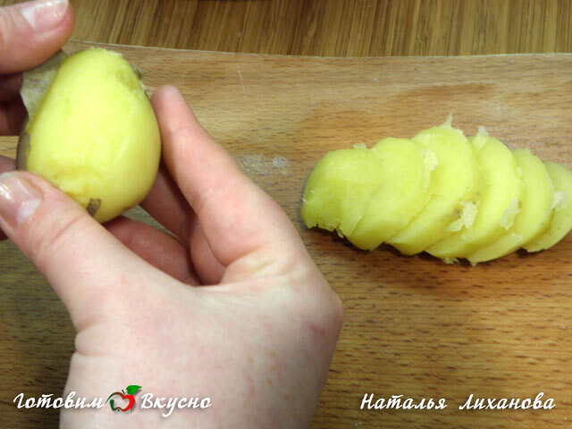 Boil the potatoes in their jackets until almost cooked. Let them cool, peel and slice into rounds.